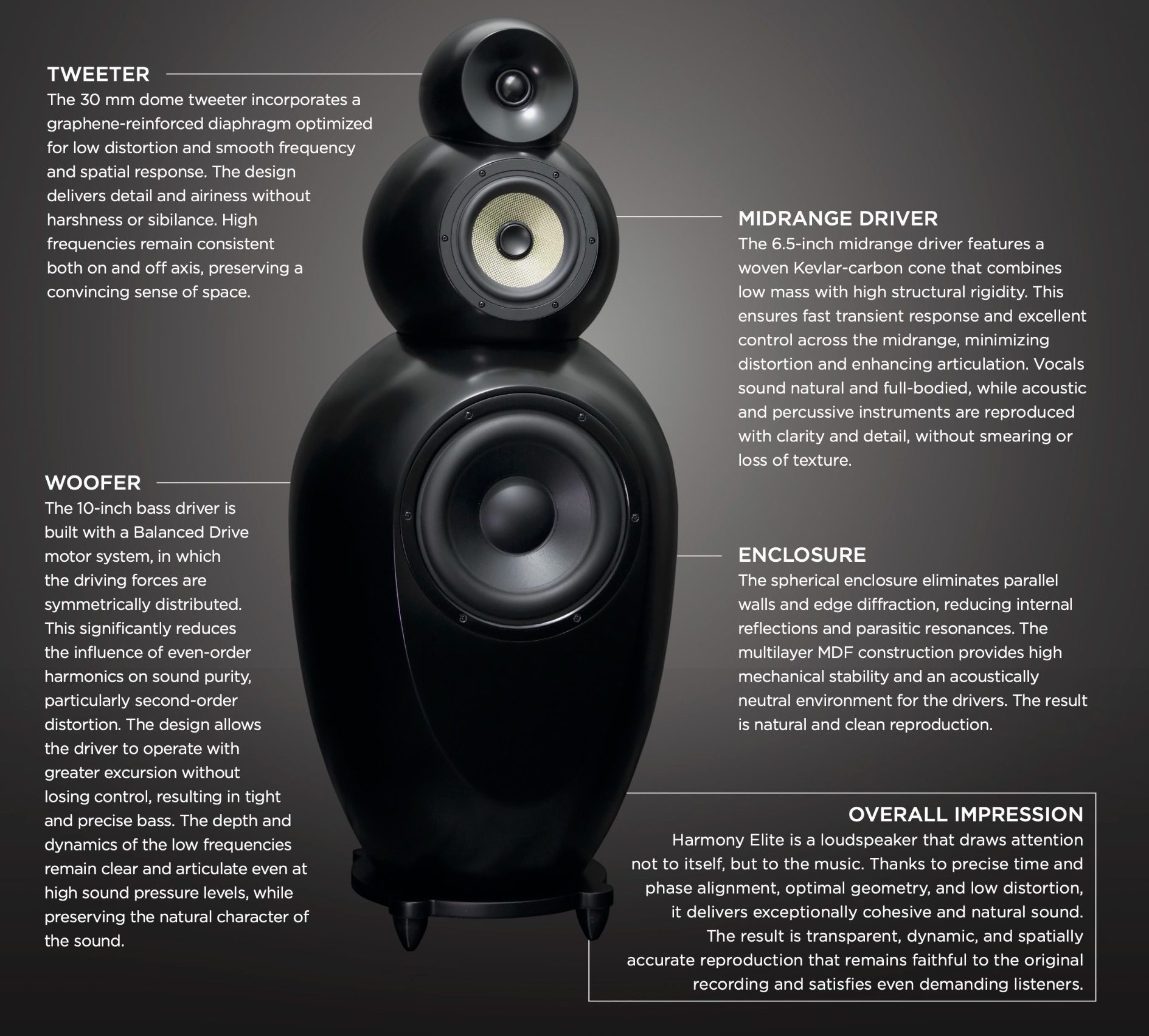 Housed in a spherical enclosure that eliminates parallel walls and internal resonances, they deliver deep and tightly controlled bass, a natural and richly detailed midrange, as well as a wide, holographic soundstage with precise instrument placement.